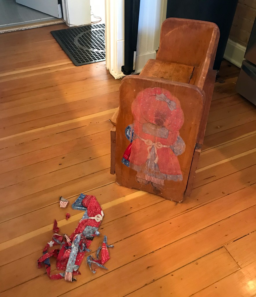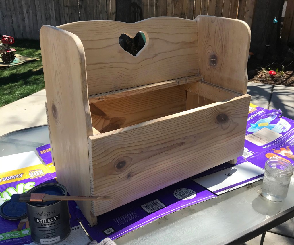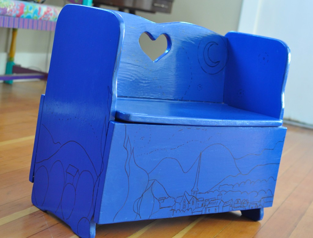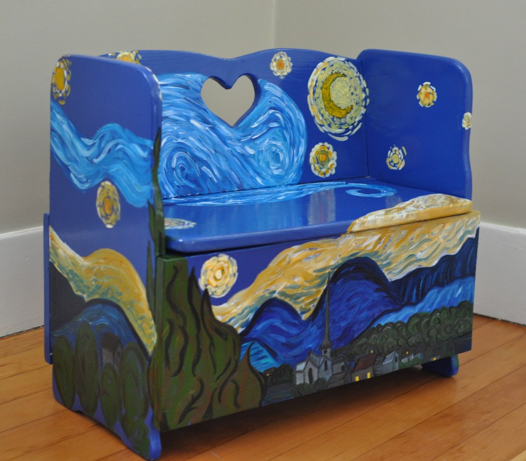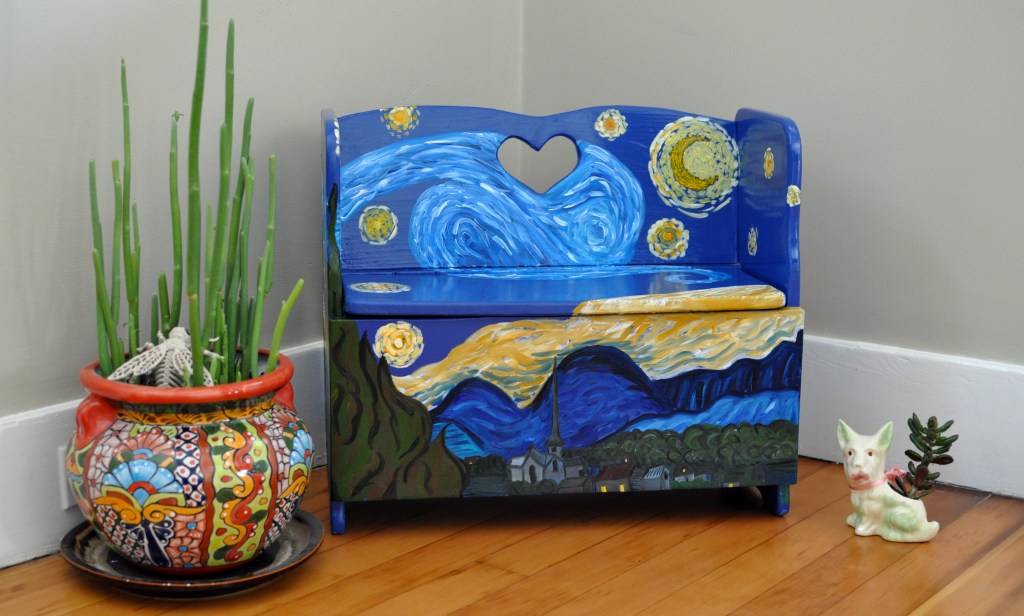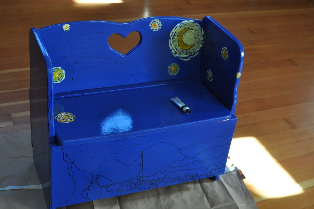 About a year ago, a dear friend of mine gifted me the cutest little bench/toy box and said that it may need some fixing up, as it looked like many-a-kid had had their share of fun with it. I have been trying to think of what to do with it at least weekly for as long as I have had it. After a few months of it sitting in my front room, my handy husband sanded it down beautifully and then it sat some more. I just needed it to be perfect. Then, I thought as I am putting together this idea for a blog, “I’ll “van Gogh” it! (That is my new term for painting Starry Night on something.) The whimsical emotion that Starry Night evokes in me seemed like a fitting theme for a child’s toy box.
