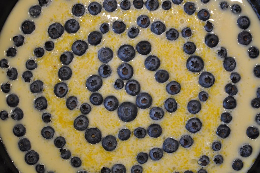 - Pour into buttered baking dish and arrange blueberries in a van Gogh-like swirl.