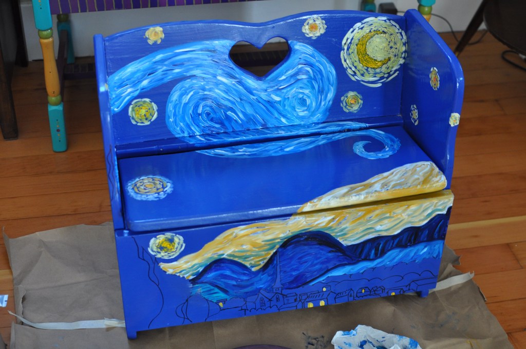 About a year ago, a dear friend of mine gifted me the cutest little bench/toy box and said that it may need some fixing up, as it looked like many-a-kid had had their share of fun with it. I have been trying to think of what to do with it at least weekly for as long as I have had it. After a few months of it sitting in my front room, my handy husband sanded it down beautifully and then it sat some more. I just needed it to be perfect. Then, I thought as I am putting together this idea for a blog, “I’ll “van Gogh” it! (That is my new term for painting Starry Night on something.) The whimsical emotion that Starry Night evokes in me seemed like a fitting theme for a child’s toy box.